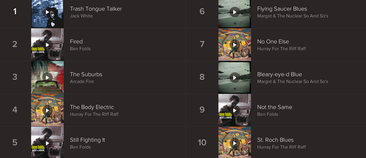Unexpected stuff here. I don’t remember listening to this Jack White track that much. I got really into Ben Folds, his brand of smart and silly, but I figured his track “Not the Same” would be higher up on the list. Also, I didn’t expect any Hurray For The Riff Raff tracks besides “The Body Electric” would make it onto my top tracks list.